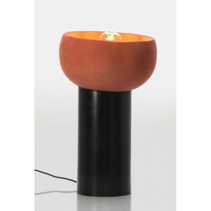 Candeeiro de mesa com base em metal preto e campânula em terracota. Possui um cabo de 2 metros de comprimento com interruptor.